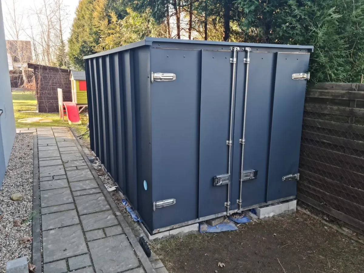 Nowoczesna elewacja z blachy na rąbek stojący wykonana na domku narzędziowym. Pokazujemy, że technologia rąbka to nie tylko kominy, ale też trwałe i estetyczne wykończenie mniejszych obiektów. Ligota Piękna
