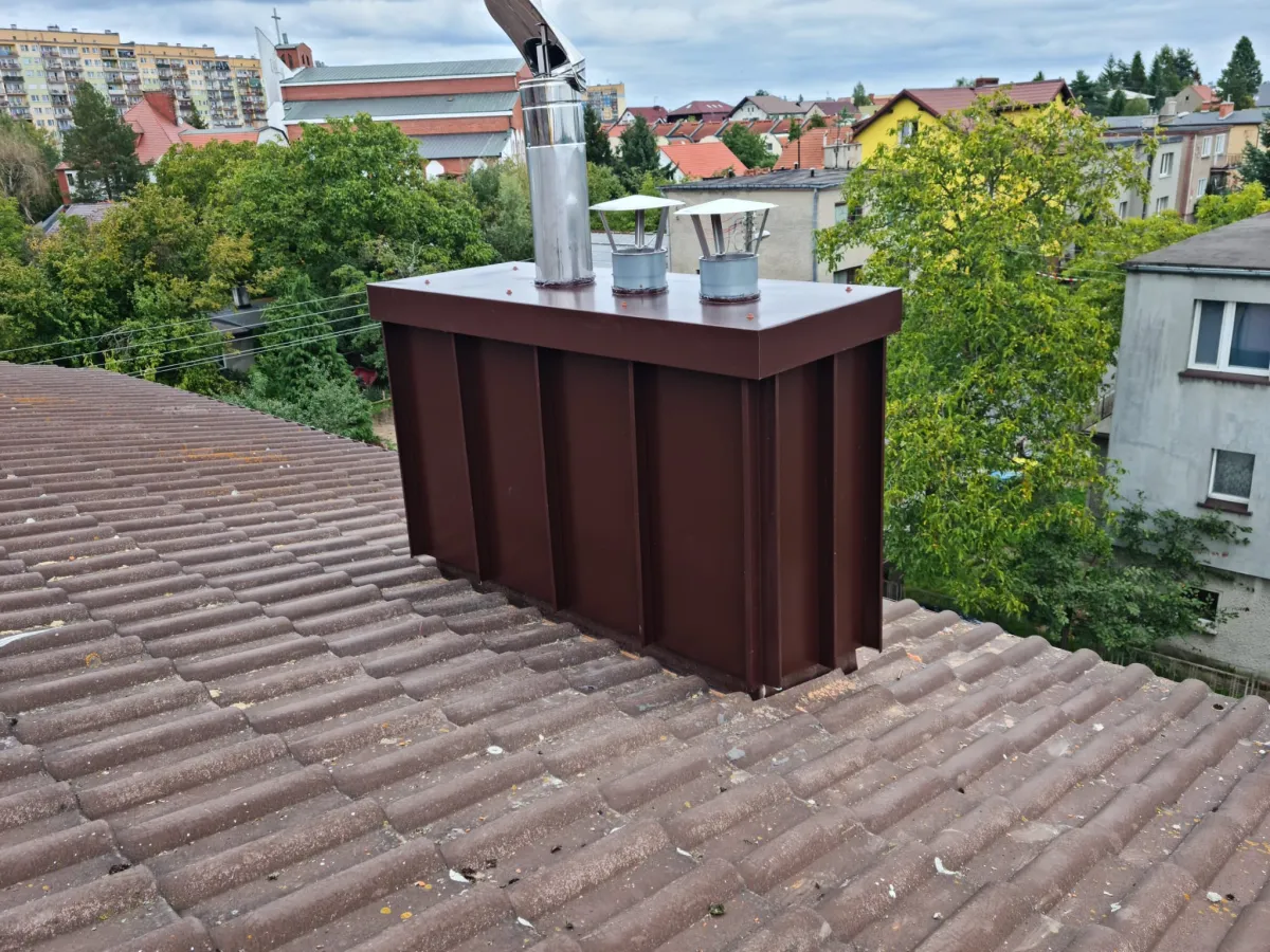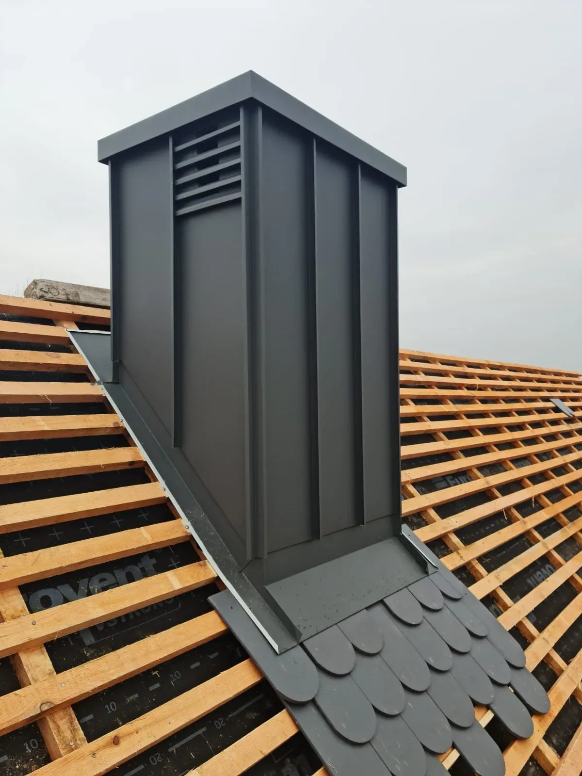 Obróbka komina rąbek stojący w kolorze antracytowym. Kompletna zabudowa ścian komina wraz z dopasowaną czapą blaszaną, zapewniająca estetyczny wygląd i 100% szczelności na lata.