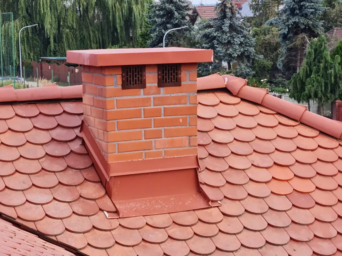 Obróbka blacharska komina klinkierowego wykonana z blachy powlekanej w kolorze ceglastym. Tradycyjna metoda rzemieślnicza zamiast taśm kominowych gwarantuje spokój na lata.